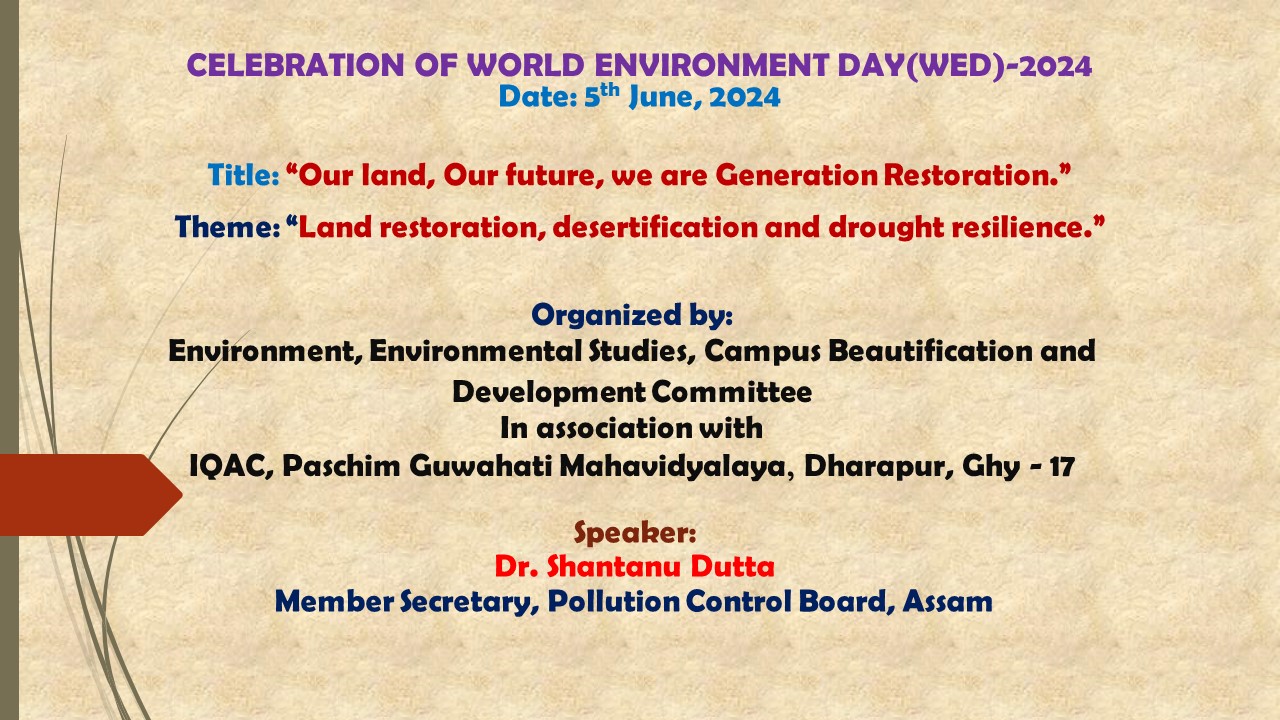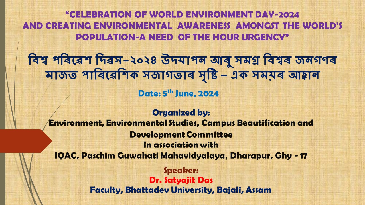 Celebration of World environment day 2024. Speaker -Dr. Satyajit Das, Faculty, Bhattadev University, Assam