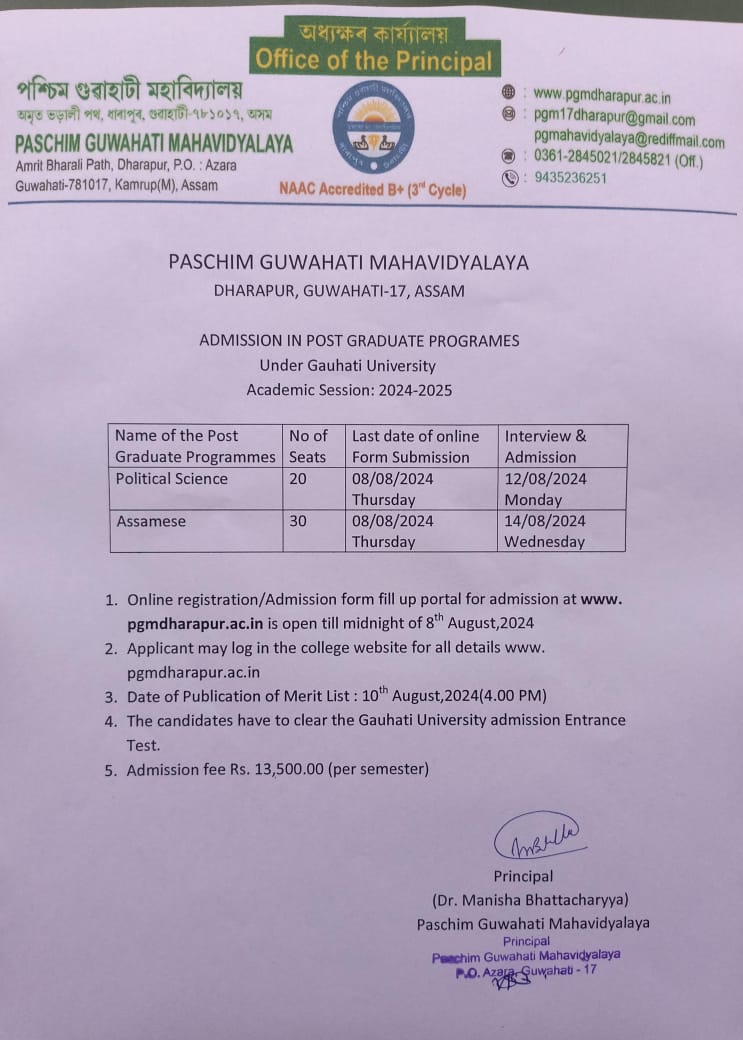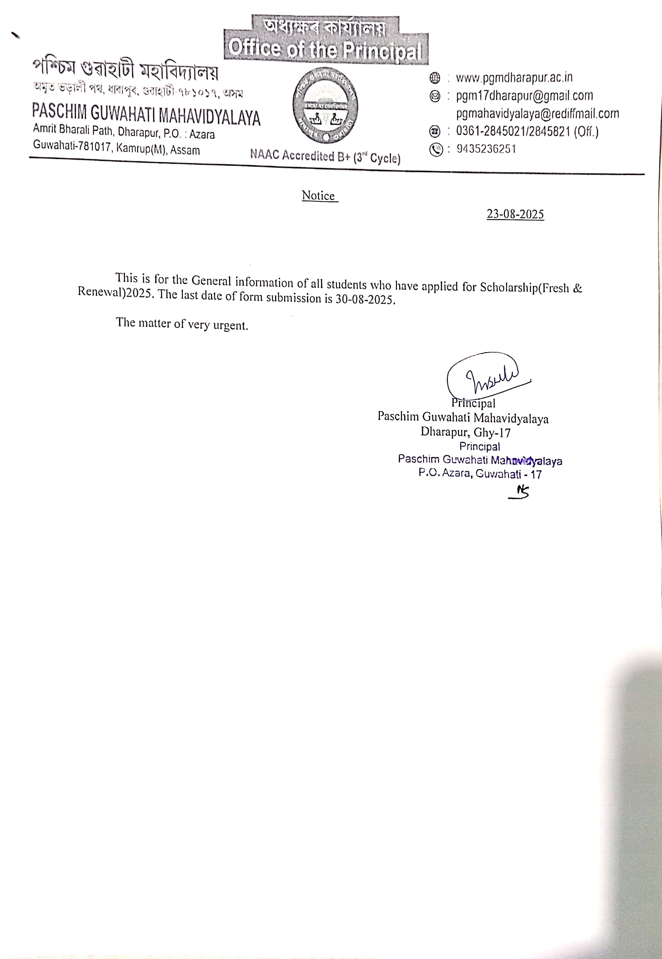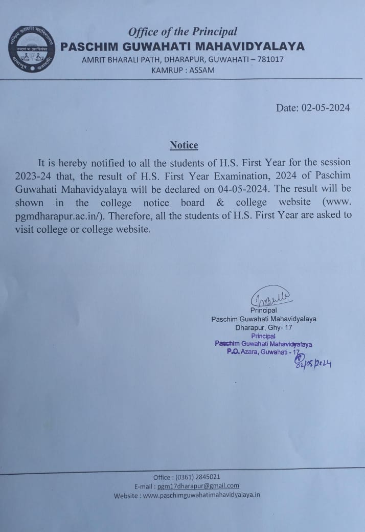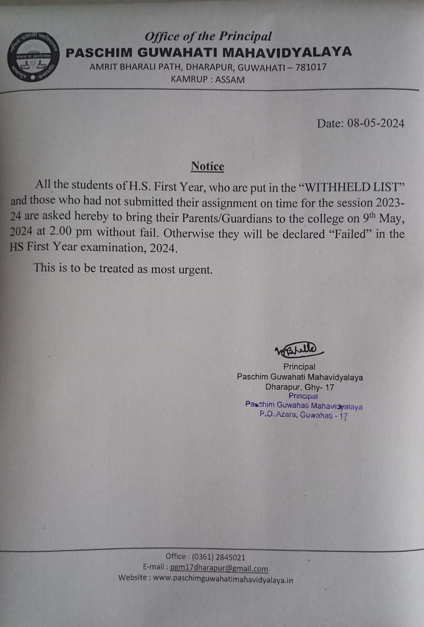 Admission Notice H.S. 1st year 2026-2027 View 2026-04-18 UG Admission Advertisement 2026-2027 View 2026-04-11 ICSSR Sponsored National Seminar, Organised by Department of Political science in collaboration with IQAC, Paschim Guwahati Mahavidyalaya View 2026-03-31 Examination Notice(CBCS) Arrear Batch 2nd, 4th and 6th semester Examination 2026 View 2026-03-12 Notice View 2026-02-10 Admission Notice Post Graduates course in Political Science & Assamese 2026 View 2026-02-10 Walk in interview BCA Department View 2026-02-10 NOTICE H.S FINAL EXAMINATION 2026 View 2026-02-09 Guidelines for providing Financial Assistance to male students under Mukhya Mantrir Nijut Moina Babu Asoni. View 2026-01-18 Notice Mukhya Mantri Nijut Babu Aasoni 2025 View 2026-01-08 Notice Higher Secondary 2nd Year(Arts & Comm.). Revision Test Examination,2025 View 2025-12-11 Invitation View 2025-12-09 Jibon prerona Scheme Declaration View 2025-12-08 B.A/B.Com FYUGP Regular Form Fill up Notice 2025 View 2025-12-08 B.A & B.com FYUGP Regular(2023) 5th semester,2025 View 2025-11-25 B.A & B.Com FYUGP Regular 2024 & FYUGP arrear 2023, form Fill up 2025 View 2025-11-22 B.Com 1st Semester Enrollment Number, Session- 2025 View 2025-11-21 BA 1st Semester Enrollemnt Number, Session- 2025 View 2025-11-21 H.S. 1st and H.S. 2nd year Half yearly Examination 2025 View 2025-10-31 HS Final Examination Fees Structure 2026 View 2025-10-24 H.S. Final year Examination form fill up 2026 View 2025-10-19 H.S.1st and 2nd year Half Yearly Examination 2025 View 2025-10-13 H.S. 2nd year Aadhar Number submitted College View 2025-10-13 Form fill-up Notice 2025-26 View 2025-10-09 PGMSU Election notice-1 View 2025-09-18 Scholarship(Fresh & Renewal) 2025 View 2025-08-23 Samarth enrolment number of B.A 1st semester, 2025 View 2025-08-18 Samarth enrolment number of B.com 1st semester, 2025 View 2025-08-18 H.S. 1st year Registration 2025-26 View 2025-08-16 Subject change notification for newly admitted students of paschim Guwahati Mahavidyalaya View 2025-08-12 BA/B.com/BCA 1st semester Major and Minor subject change View 2025-08-12 Merit list Post Graduate Assamese 2025 View 2025-08-06 Merit List Post Graduate(Political Science) 2025 View 2025-08-05 B.A & B.Com 3rd & 5th semester Admission Notice 2025 View 2025-07-22 BA & B.com 3rd and 5th semester Admission Notice 2025 View 2025-07-22 Notice regarding FYUGP(B.A/B.Com) 3rd and 5th semester admission for the session 2025-26 View 2025-07-21 PG Admission Notice for Political Science & Assamese 2025 View 2025-07-10 Scholarship Opportunity from Geeta University View 2025-06-26 Admission Notice View 2025-06-19 Notice regarding Darpan Online Admission View 2025-06-18 2nd Merit List for admission into BA Course of Paschim Guwahati Mahavidyalaya View 2025-06-12 2nd Merit List for admission into B. Com Course of Paschim Guwahati Mahavidyalaya View 2025-06-12 2nd Merit List for admission into BCA Course of Paschim Guwahati Mahavidyalaya View 2025-06-12 BCA Merit List 2025-26 View 2025-06-03 B.Com Merit List 2025-26 View 2025-06-03 BA Merit List 2025-26 View 2025-06-03 Admission Notice View 2025-05-26 Timeline for UG admission 2025-26 View 2025-05-09 Admission Process manual-Registration and admission process for FYUGP 1st Semester View 2025-05-09 Classes of HS 2nd Year for the session 2025-26 View 2025-05-06 Class Routine for even semesters of Commerce, January to June, 2025 View 2025-02-04 Class Routine for even semesters of Arts, January to June, 2025 View 2025-02-04 FYUGP 1ST & 3RD SEM EXAM FORM FILL UP NOTIFICATION 2024 View 2024-12-03 Election Notice View 2024-09-26 HS 1st Year Registration Card Distribution For the Session 2023-24 View 2024-08-20 Roll no. of HS 1st Year(Commerce), 2024-25 View 2024-08-19 Roll no. of HS 1st Year(Arts), 2024-25 View 2024-08-19 Office Notice 13/08/2024 View 2024-08-13 Important Notice for Students 09/08/2024 View 2024-08-09 Walk in Interview (Dept. of Pol. Science) View 2024-08-03 CLASS ROUTINE FOR COMMERCE STREAM 2024-25 View 2024-08-03 CLASS ROUTINE FOR ARTS STREAM 2024-25 View 2024-08-03 Admission in PG Programmes for the academic session 2024-25 View 2024-08-02 Walk in Interview for the post of IT Associate View 2024-07-18 Cutoff Percentage of 2nd Merit list View 2024-06-25 Admission Notice FYUGP BA, B.Com. & BCA (2024-25) View 2024-06-14 Celebration of World environment day 2024. View 2024-06-04 Urgent notification for BA/B.Com./BCA 2nd Semester Examination, 2024 View 2024-06-01 Timelines for FYUGP admission 2024-25 View 2024-05-25 Admission notice by DHE, 2024_2025 View 2024-05-25 Question Paper design of BA 2nd Semester Examination. View 2024-05-24 SEC 2nd Semester examination notice View 2024-05-24 Notice of writing for the 2023-24 college megazine. View 2024-05-22 Admission Notice for HS 2nd Year, 2024-25 View 2024-05-22 Registration link for BCA Students(2024-25) View 2024-05-22 H.S. 1st Year Commerce Merit List for Unreserved Category View 2024-05-18 H.S. 1st Year Arts Merit List for Unreserved Category View 2024-05-18 H.S. 1st Year Arts Waiting List for Reserved Category View 2024-05-18 H.S. 1st Year Arts Waiting List for Unreserved Category View 2024-05-18 H.S. 1st Year Commerce Merit List for Reserved Category View 2024-05-18 H.S. 1st Year Commerce Merit List for Reserved Category View 2024-05-18 Notification for Rechecking of answer scripts (HS Final Examination) View 2024-05-15 H. S. 2nd year class notice View 2024-05-10 H. S. First Year Notice View 2024-05-08 Demonstration class of UG First Semester admission procedure for the academic session 2024-25 View 2024-05-08 H. S. First Year Result View 2024-05-04 Faculty Development Programme on "E-content development & Digital Mode of Teaching" View 2024-05-04 Class Attendance Notice, H. S. 2nd year. View 2024-05-02 H. S. First Year Notice. View 2024-05-02 PG Examination form fillup notice. Students can fill-up the examination form through their own log in. Last date 10/05/2024 View 2024-04-24 Online Training on NEP orie
