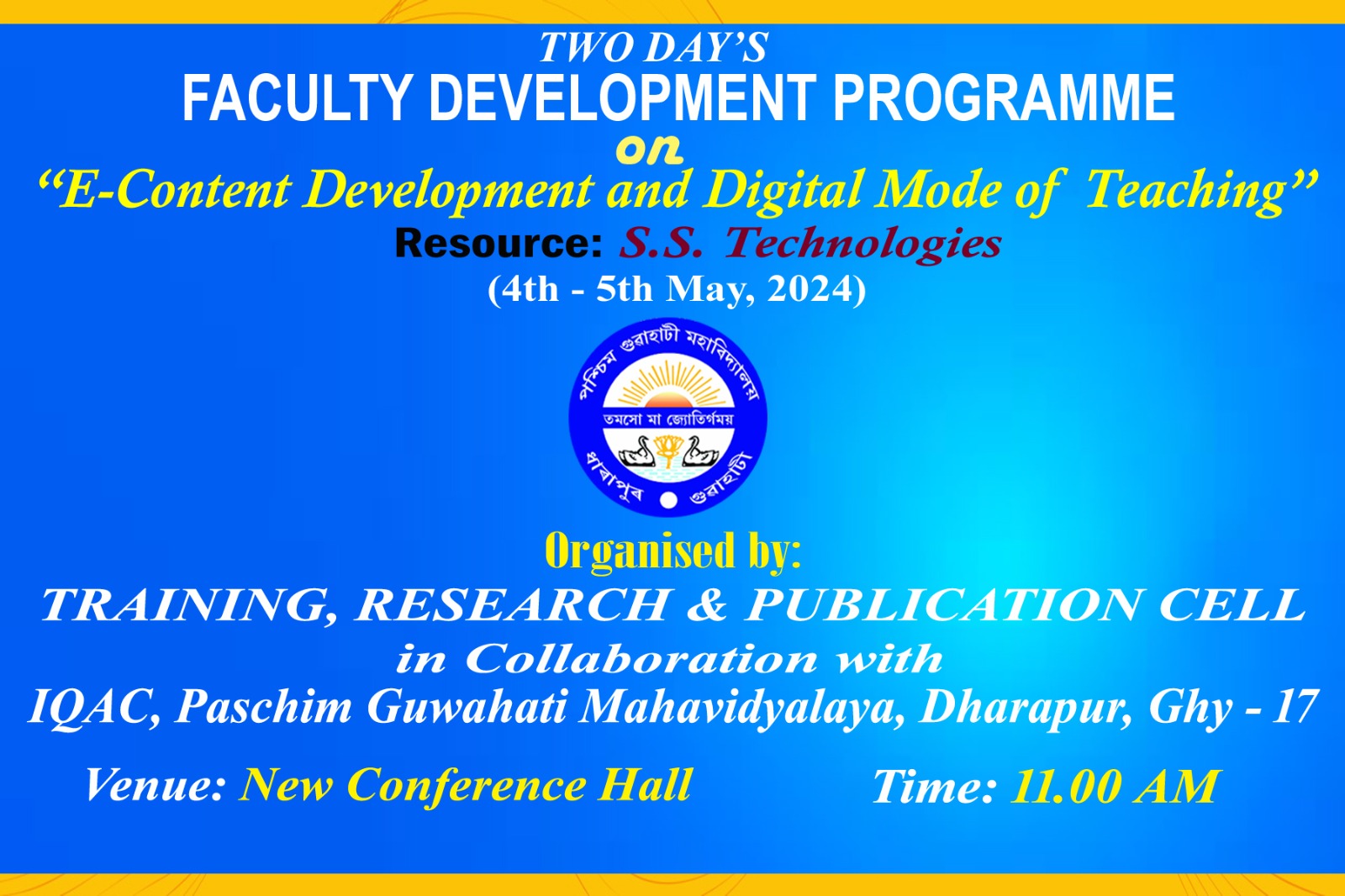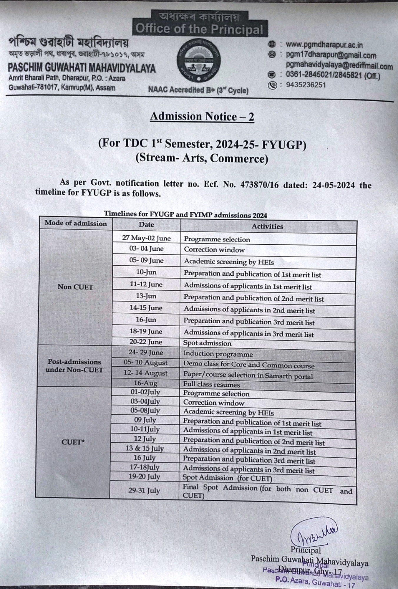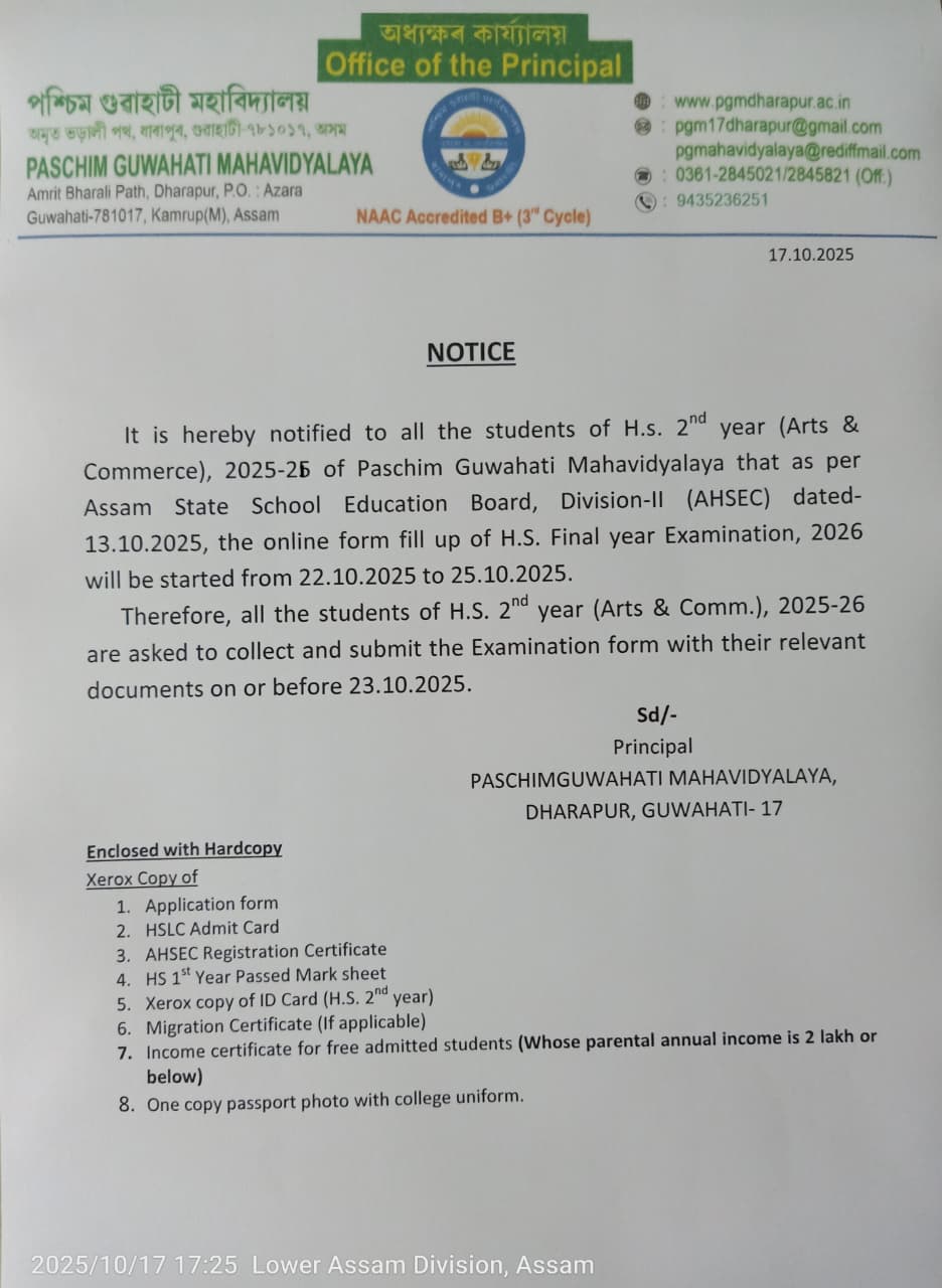 Admission Notice H.S. 1st year 2026-2027 View 2026-04-18 UG Admission Advertisement 2026-2027 View 2026-04-11 ICSSR Sponsored National Seminar, Organised by Department of Political science in collaboration with IQAC, Paschim Guwahati Mahavidyalaya View 2026-03-31 Examination Notice(CBCS) Arrear Batch 2nd, 4th and 6th semester Examination 2026 View 2026-03-12 Notice View 2026-02-10 Admission Notice Post Graduates course in Political Science & Assamese 2026 View 2026-02-10 Walk in interview BCA Department View 2026-02-10 NOTICE H.S FINAL EXAMINATION 2026 View 2026-02-09 Guidelines for providing Financial Assistance to male students under Mukhya Mantrir Nijut Moina Babu Asoni. View 2026-01-18 Notice Mukhya Mantri Nijut Babu Aasoni 2025 View 2026-01-08 Notice Higher Secondary 2nd Year(Arts & Comm.). Revision Test Examination,2025 View 2025-12-11 Invitation View 2025-12-09 Jibon prerona Scheme Declaration View 2025-12-08 B.A/B.Com FYUGP Regular Form Fill up Notice 2025 View 2025-12-08 B.A & B.com FYUGP Regular(2023) 5th semester,2025 View 2025-11-25 B.A & B.Com FYUGP Regular 2024 & FYUGP arrear 2023, form Fill up 2025 View 2025-11-22 B.Com 1st Semester Enrollment Number, Session- 2025 View 2025-11-21 BA 1st Semester Enrollemnt Number, Session- 2025 View 2025-11-21 H.S. 1st and H.S. 2nd year Half yearly Examination 2025 View 2025-10-31 HS Final Examination Fees Structure 2026 View 2025-10-24 H.S. Final year Examination form fill up 2026 View 2025-10-19 H.S.1st and 2nd year Half Yearly Examination 2025 View 2025-10-13 H.S. 2nd year Aadhar Number submitted College View 2025-10-13 Form fill-up Notice 2025-26 View 2025-10-09 PGMSU Election notice-1 View 2025-09-18 Scholarship(Fresh & Renewal) 2025 View 2025-08-23 Samarth enrolment number of B.A 1st semester, 2025 View 2025-08-18 Samarth enrolment number of B.com 1st semester, 2025 View 2025-08-18 H.S. 1st year Registration 2025-26 View 2025-08-16 Subject change notification for newly admitted students of paschim Guwahati Mahavidyalaya View 2025-08-12 BA/B.com/BCA 1st semester Major and Minor subject change View 2025-08-12 Merit list Post Graduate Assamese 2025 View 2025-08-06 Merit List Post Graduate(Political Science) 2025 View 2025-08-05 B.A & B.Com 3rd & 5th semester Admission Notice 2025 View 2025-07-22 BA & B.com 3rd and 5th semester Admission Notice 2025 View 2025-07-22 Notice regarding FYUGP(B.A/B.Com) 3rd and 5th semester admission for the session 2025-26 View 2025-07-21 PG Admission Notice for Political Science & Assamese 2025 View 2025-07-10 Scholarship Opportunity from Geeta University View 2025-06-26 Admission Notice View 2025-06-19 Notice regarding Darpan Online Admission View 2025-06-18 2nd Merit List for admission into BA Course of Paschim Guwahati Mahavidyalaya View 2025-06-12 2nd Merit List for admission into B. Com Course of Paschim Guwahati Mahavidyalaya View 2025-06-12 2nd Merit List for admission into BCA Course of Paschim Guwahati Mahavidyalaya View 2025-06-12 BCA Merit List 2025-26 View 2025-06-03 B.Com Merit List 2025-26 View 2025-06-03 BA Merit List 2025-26 View 2025-06-03 Admission Notice View 2025-05-26 Timeline for UG admission 2025-26 View 2025-05-09 Admission Process manual-Registration and admission process for FYUGP 1st Semester View 2025-05-09 Classes of HS 2nd Year for the session 2025-26 View 2025-05-06 Class Routine for even semesters of Commerce, January to June, 2025 View 2025-02-04 Class Routine for even semesters of Arts, January to June, 2025 View 2025-02-04 FYUGP 1ST & 3RD SEM EXAM FORM FILL UP NOTIFICATION 2024 View 2024-12-03 Election Notice View 2024-09-26 HS 1st Year Registration Card Distribution For the Session 2023-24 View 2024-08-20 Roll no. of HS 1st Year(Commerce), 2024-25 View 2024-08-19 Roll no. of HS 1st Year(Arts), 2024-25 View 2024-08-19 Office Notice 13/08/2024 View 2024-08-13 Important Notice for Students 09/08/2024 View 2024-08-09 Walk in Interview (Dept. of Pol. Science) View 2024-08-03 CLASS ROUTINE FOR COMMERCE STREAM 2024-25 View 2024-08-03 CLASS ROUTINE FOR ARTS STREAM 2024-25 View 2024-08-03 Admission in PG Programmes for the academic session 2024-25 View 2024-08-02 Walk in Interview for the post of IT Associate View 2024-07-18 Cutoff Percentage of 2nd Merit list View 2024-06-25 Admission Notice FYUGP BA, B.Com. & BCA (2024-25) View 2024-06-14 Celebration of World environment day 2024. View 2024-06-04 Urgent notification for BA/B.Com./BCA 2nd Semester Examination, 2024 View 2024-06-01 Timelines for FYUGP admission 2024-25 View 2024-05-25 Admission notice by DHE, 2024_2025 View 2024-05-25 Question Paper design of BA 2nd Semester Examination. View 2024-05-24 SEC 2nd Semester examination notice View 2024-05-24 Notice of writing for the 2023-24 college megazine. View 2024-05-22 Admission Notice for HS 2nd Year, 2024-25 View 2024-05-22 Registration link for BCA Students(2024-25) View 2024-05-22 H.S. 1st Year Commerce Merit List for Unreserved Category View 2024-05-18 H.S. 1st Year Arts Merit List for Unreserved Category View 2024-05-18 H.S. 1st Year Arts Waiting List for Reserved Category View 2024-05-18 H.S. 1st Year Arts Waiting List for Unreserved Category View 2024-05-18 H.S. 1st Year Commerce Merit List for Reserved Category View 2024-05-18 H.S. 1st Year Commerce Merit List for Reserved Category View 2024-05-18 Notification for Rechecking of answer scripts (HS Final Examination) View 2024-05-15 H. S. 2nd year class notice View 2024-05-10 H. S. First Year Notice View 2024-05-08 Demonstration class of UG First Semester admission procedure for the academic session 2024-25 View 2024-05-08 H. S. First Year Result View 2024-05-04 Faculty Development Programme on "E-content development & Digital Mode of Teaching" View 2024-05-04 Class Attendance Notice, H. S. 2nd year. View 2024-05-02 H. S. First Year Notice. View 2024-05-02 PG Examination form fillup notice. Students can fill-up the examination form through their own log in. Last date 10/05/2024 View 2024-04-24 Online Training on NEP orie